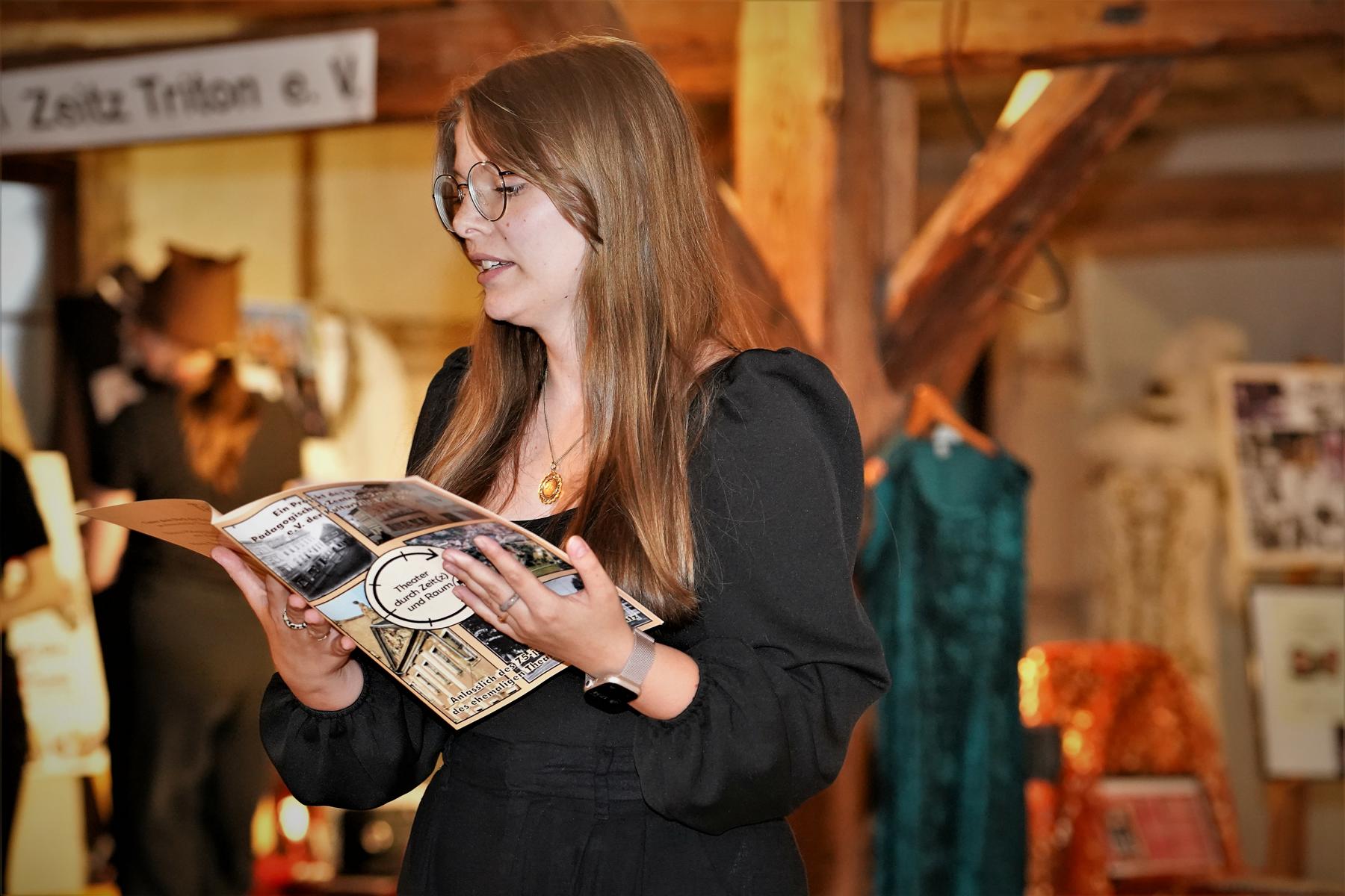Die Theatergruppe wäre keine solche, hätte sie nicht diese Ausstellung und die Präsentation der 32-seitigen Dokumentation mit einem kleinen Potpourri eröffnet. Mitautorin Julia Rothe war es dann auch, die mit einem kleinen Textauszug jene anfangs erwähnte Nachdenklichkeit anregte. Sie spricht beim Theaterschaffen in Zeitz von einer Berg- und Talfahrt. Was Insider wussten hätten nun auch die Recherchen belegt – die wesentlichen Impulse für Theaterkultur kamen hier meistens von außen oder von einzelnen Bürgern und wurden alsdann entscheidend von wenigen Persönlichkeiten getragen. Höhere Instanzen hätten solche Impulse kaum bewusst gesetzt. Die jungen Schatzgräber hätten in ihren Sichtungen von Unterlagen, Veröffentlichungen und Dokumenten eine über die Jahrzehnte abnehmende Euphorie insbesondere für die Theaterkultur wahrgenommen.