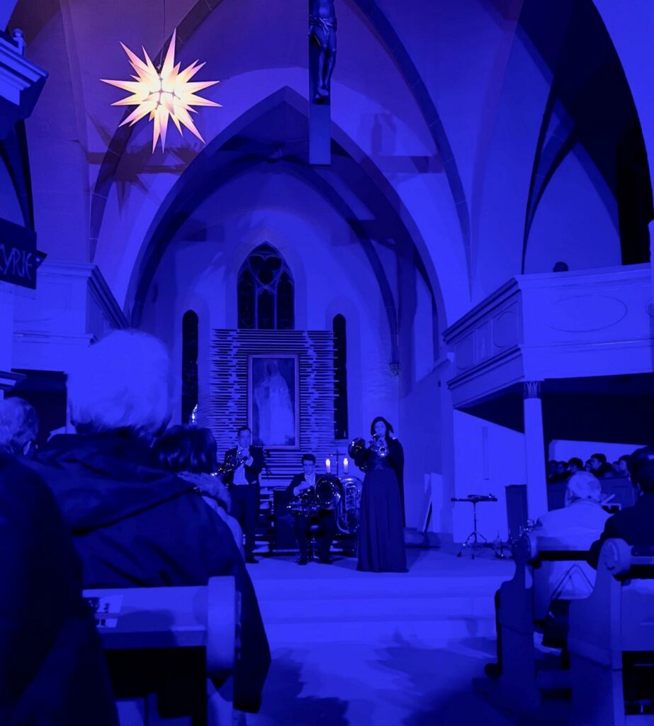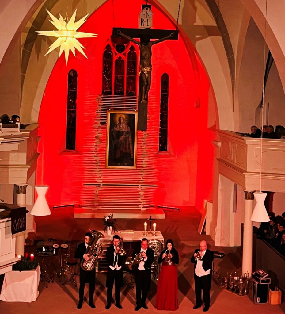 Samstag entführte HARMONIC BRASS das begeisterte Publikum in der prall gefüllten Michaeliskirche auf eine Reise rund um die Welt. Choräle von Bach und Händel, Musiken der beliebtesten Filme an Weihnachten, Weihnachtliches über Südsee und Karibik bis in den hohen Norden – fein arrangiert für die virtuosen Solisten dieses Ausnahme-Quintetts. Das Ganze begleitet von farblichen Lichtarrangements und den heiteren Überleitungen von Andreas Binder, der als gewohnt charmanter Conférencier durch das Programm führte.