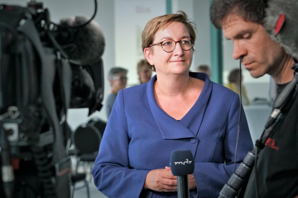 Bundesbaumisterin Klara Geywitz informiert sich über wichtige Projekte in Zeitz und beantwortet Fragen im Bürgerdialog. Zwei Koffer wird sie mit nach Berlin nehmen.