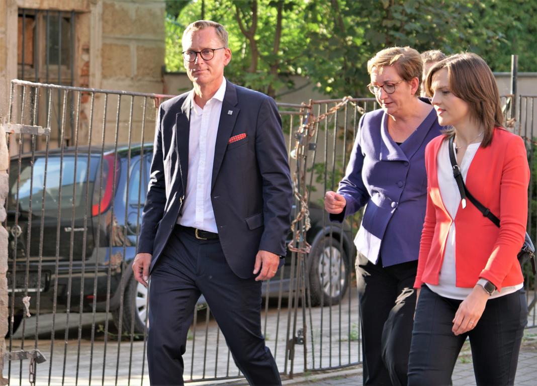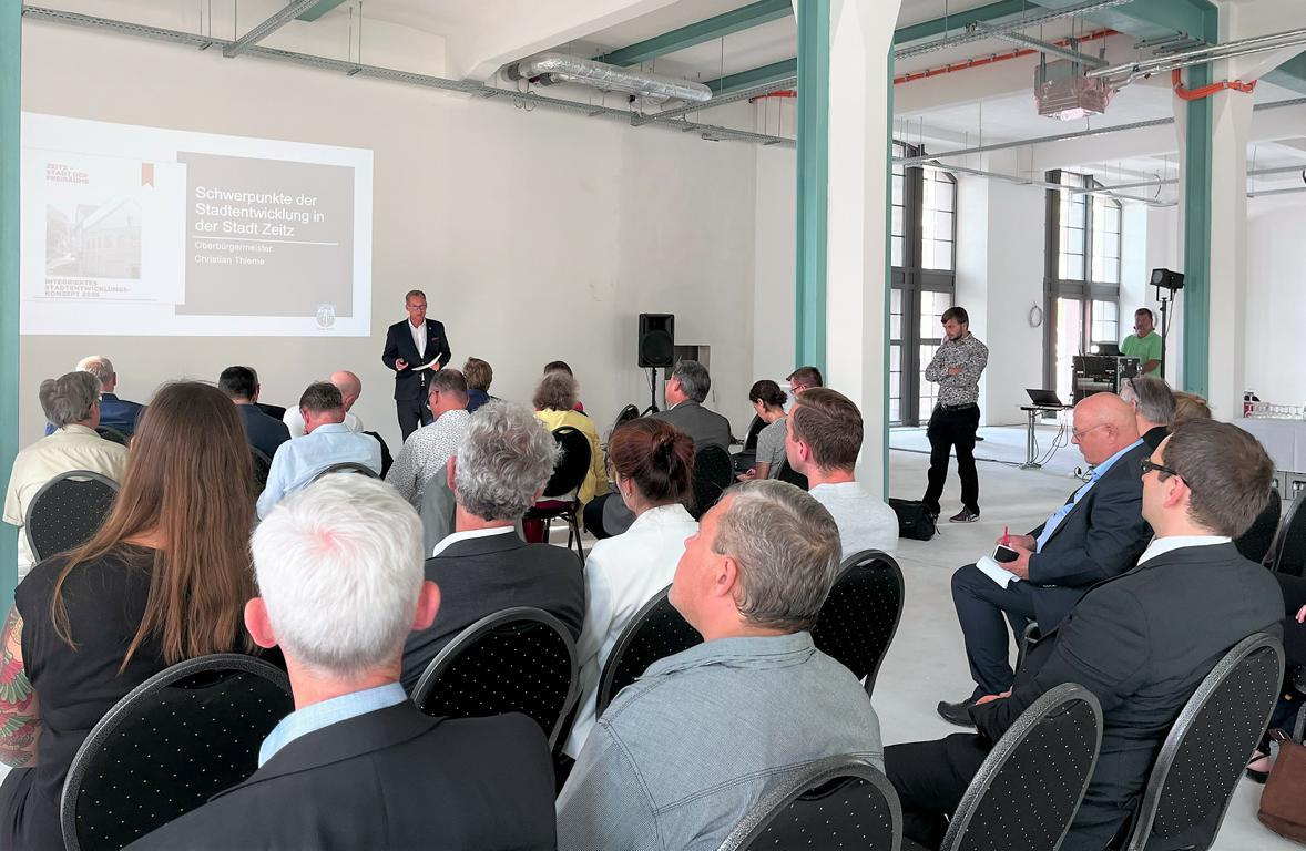 Vor dem kleinen Rundgang um das ZEKIWA-Gelände gab es für die Ministerin Input über Schwerpunkte im Städtebaulichen der Stadt und das Sachsen-Anhaltprojekt „Neues Europäisches Bauhaus„. OB Christian Thieme, Martin Stein als Teamleiter des Projektbüros „Stadt der Zukunft Zeitz“ sowie Dr. Werner Möller von der Stiftung Bauhaus Dessau trugen hierzu vor. Thieme versäumte nicht, der Ministerin mit auf den Weg zu geben, wie wichtig für Stadt und Region der S-Bahnanschluss von Leipzig über Zeitz nach Gera sei.