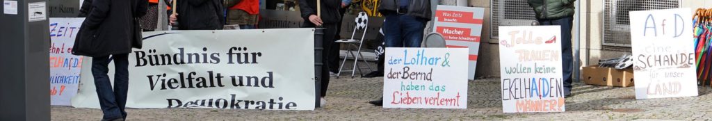 „da drüben“, bei den zahlreichen Gegendemonstranten machte gerade die spontane Wortmeldung von Sebastian Hakelberg Eindruck. Der werdende Vater ist erst seit kurzem Neuzeitzer und bekannte, er wolle seinem Kind kein homophobes, rassistisches, intolerantes Land zumuten. Deshalb sei er hier und wolle nicht, dass diese Stadt von der AfD vertreten wird. Das war ehrlich, kam aus dem Herzen und fand viel Beifall.