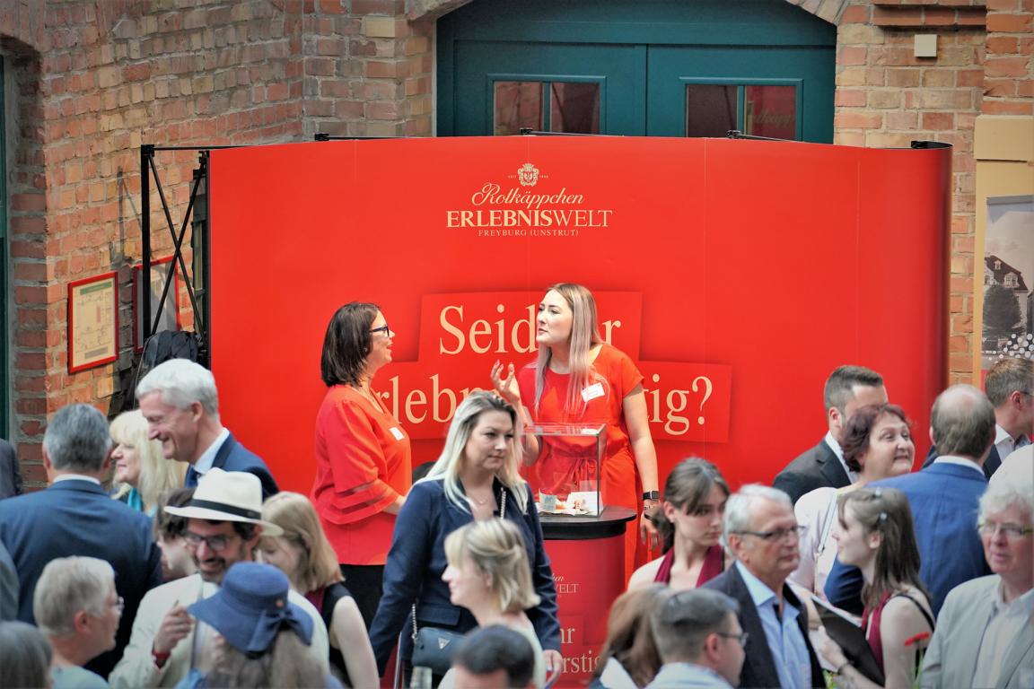 Zu Empfängen dieser Art gehören Reden. Meistens Festreden. Dieser Sommerempfang im Lichthof bei Rotkäppchen-Mumm bot an Höhepunkten einiges: das Jubiläum 200 Jahre Sparkasse, die Auszeichnung „Unternehmer des Jahres“, der Auftritt des Oberstufenchores des GSG Zeitz und, und, und … und natürlich der wunderbare Sekt.