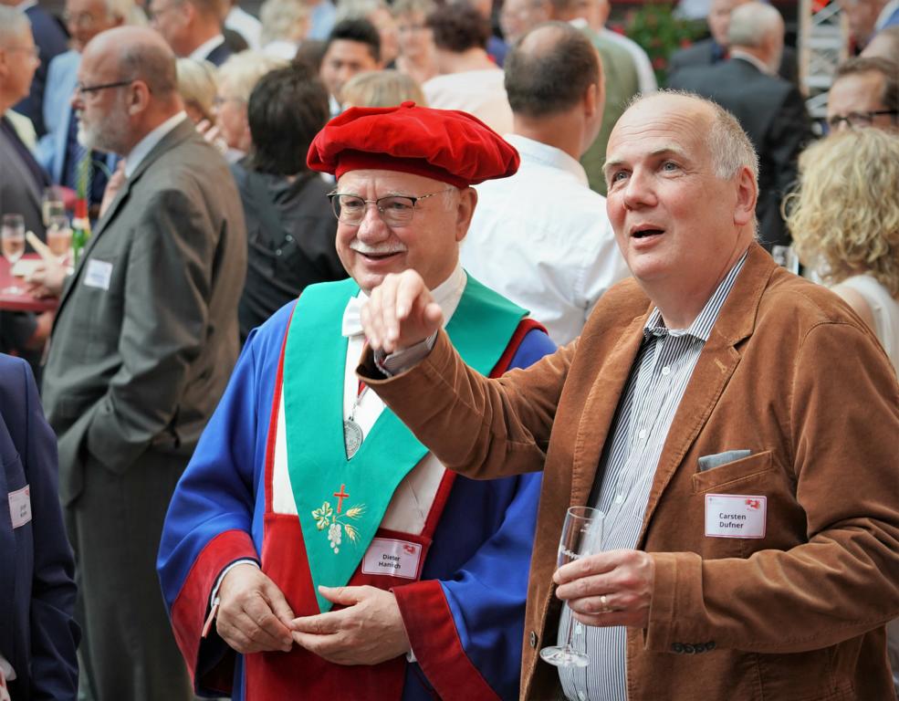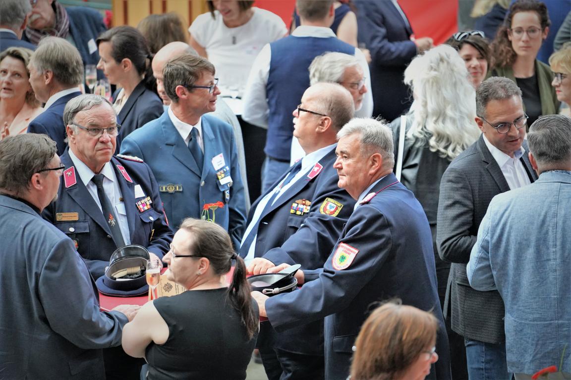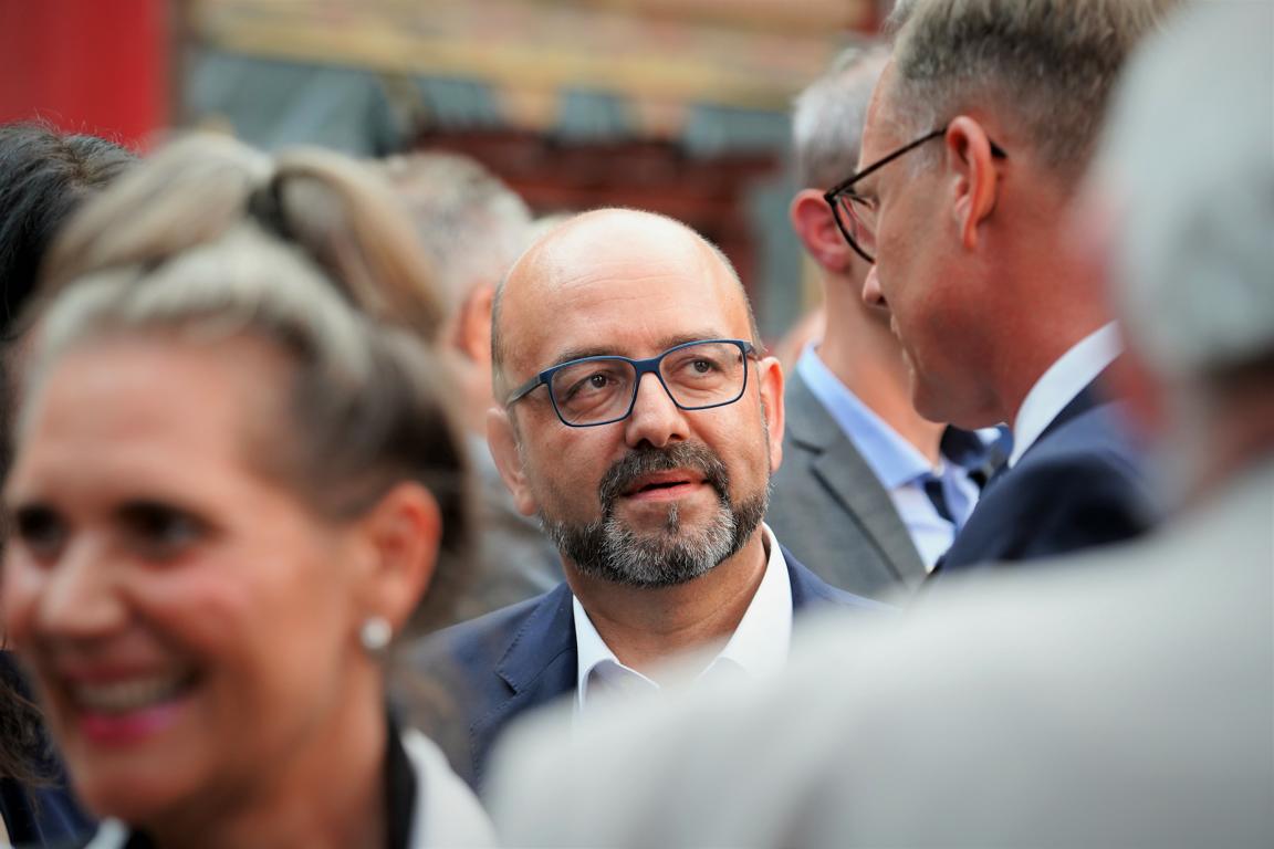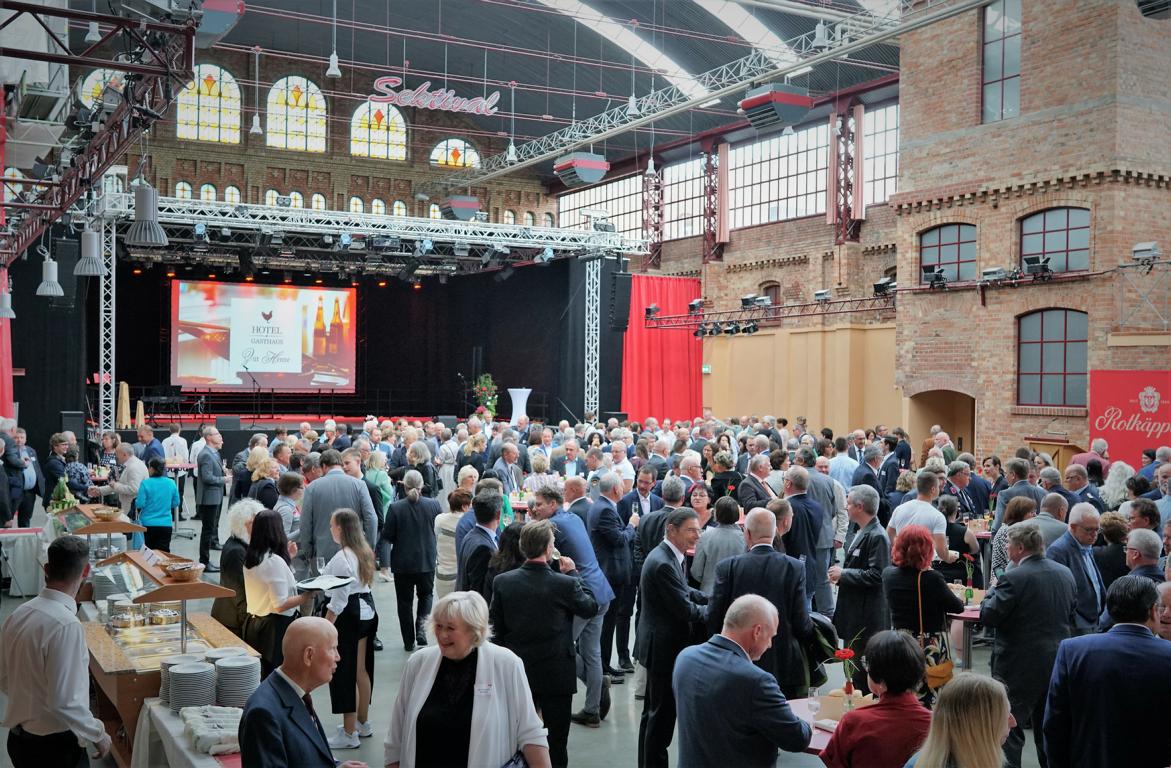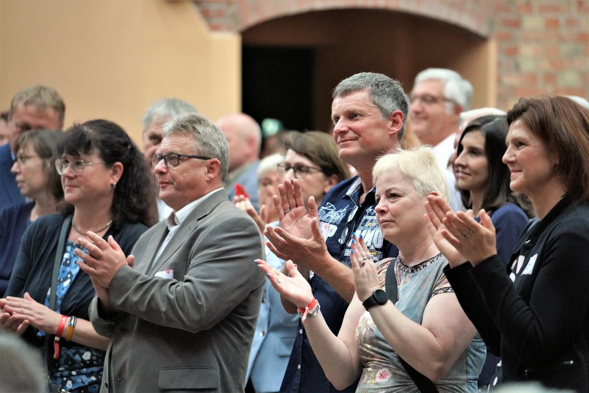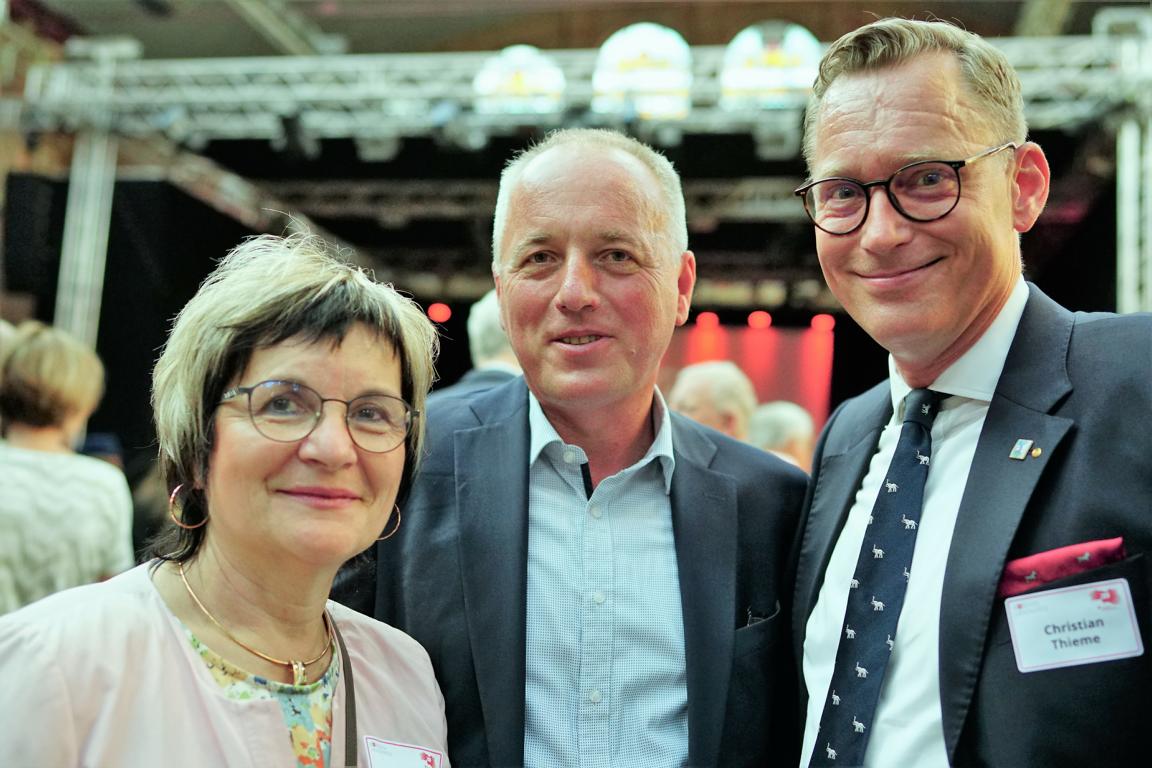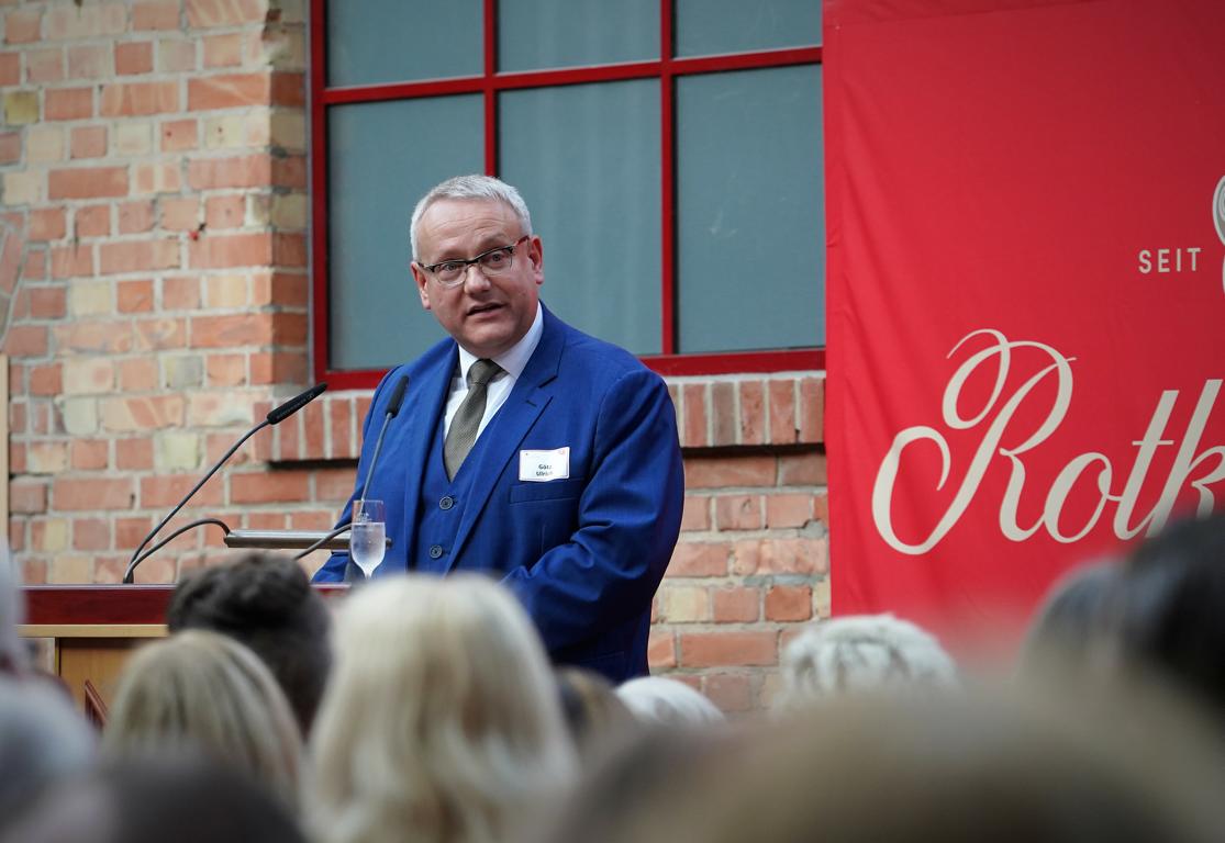 Ein Stück hin schien jemand die Luft anzuhalten, flüsternd „der traut sich was“. So, als dürfe er das nicht. Doch, er darf, er muss sogar beklagen und warnen, wenn nahezu alle Kommunen ihre Haushalte nicht ausgleichen können, weil die Ausgaben steigen und die Einnahmen sinken. Als Landrat spricht Götz Ulrich zurecht an, dass eine überbordende Bürokratisierung gerade bei Fördermittelbeantragung-, Verwendung- und Nachweisführung Ressourcen verschlingt, die „unsere Verwaltung längst an ihre Grenzen bringt“. Das sei ja nun alles nicht neu. Die chronisch mangelhafte Finanzausstattung der Kommunen, die offenbar auf mangelndem Vertrauen beruhende längst aus dem Ruder gelaufene Kontroll- und Nachweisbürokratie, nicht nachvollziehbar ewig lange Genehmigungsverfahren – alle diese Probleme hätte die Politik bei ihren Besuchen als „Problem erkannt, mitgenommen“. Ihm wäre nach der Mitnahme nun aber auch an den Lösungen der Probleme gelegen, rief Ulrich unter Applaus aus. Er hätte ungefähr eine Vorstellung davon, wie groß eine Lagerhalle sein müsse, um alle „von unten mitgenommen und bis heute ungelösten Probleme“ zu beherbergen. Ein Bild, das Dr. Mike Eberle, COO bei Rotkäppchen, nach der Rede aufnehmen wird und schonmal ankündigt, Rotkäppchen würde den geräumigen Lichthof für solcherlei Zwecke der Problemlagerung nicht hergeben – Heiterkeit und Applaus.