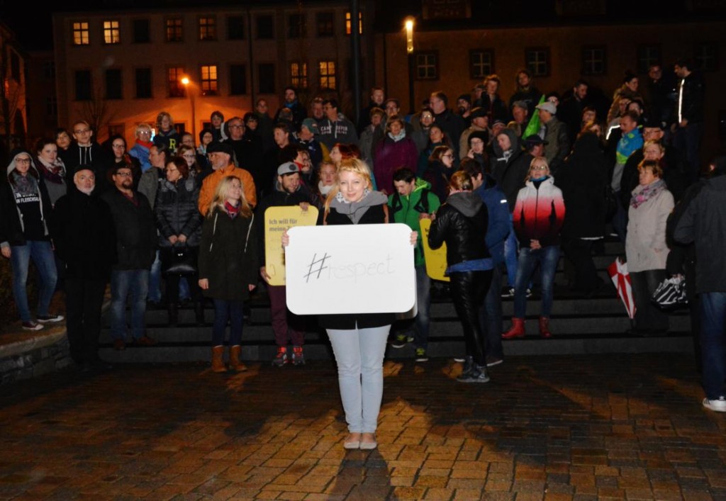 Freudig überrascht zeigt sich Diana Theil darüber, dass 100 Zeitzerinnen und Zeitzer ihrem Aufruf „Gesicht zeigen“ auf den Zeitzer Altmarkt gefolgt waren.