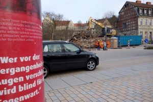 Sicher, „allein von Geschichte“ und „allein von alter Bausubstanz“ leben wir ebenso wenig, wie allein von der Kunst, allein vom Kreativen oder allein von der Kultur. Im Kontext zum Veranstaltungsort und dem viel diskutierten Umgang der Stadt mit seiner Geschichte in Form historischer Bausubstanz allerdings scheinen diese Sätze doch eher für einen Trend zu sprechen. Einen traurigen Trend. Noch während man sich Hände schüttelnd an der Wiege der Stadt zum Foto verabredet, noch während man Plakate klebt mit der Aufschrift „Wer vor der Vergangenheit die Augen verschließt, wird blind für die Gegenwart“ wird keine zwanzig Meter hin Geschichte entfernt als wäre sie ein Tumor.