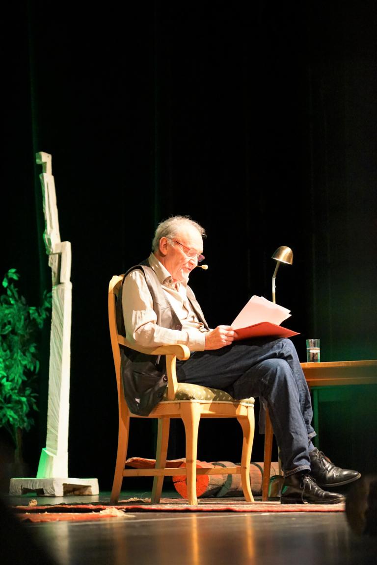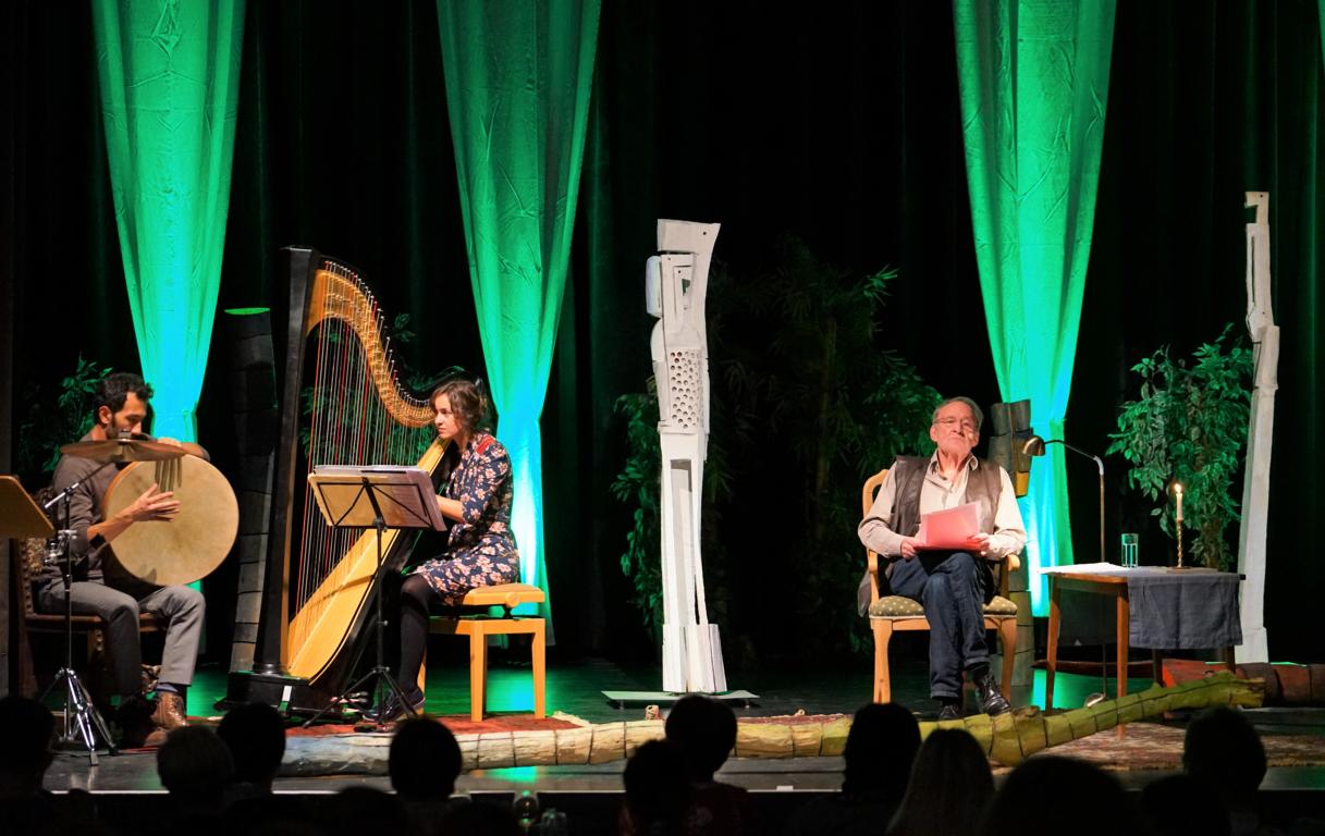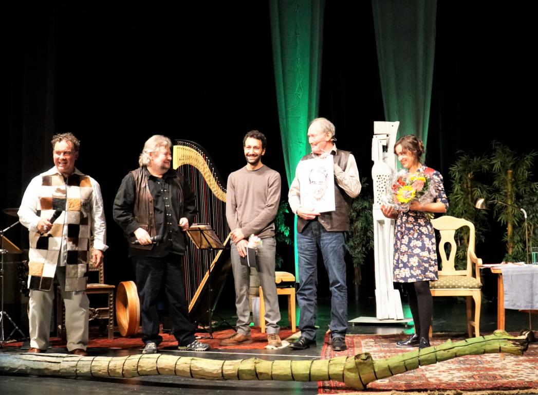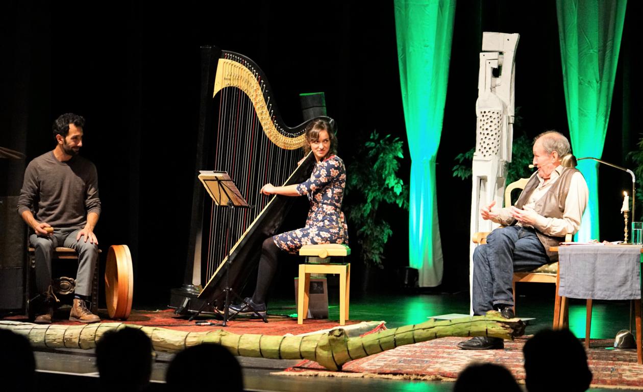 Die Mendl Festspiele gingen am Samstag mit „URWORTE“ zu Ende. Tags zuvor befielen Vipern, Kobras und eine Boa die Bühne im Zeitzer Capitol. Michael Mendl erzählte die Geschichte von ANACONDA des uruguayischen Autors Horacio Quiroga. Optisch setzten geschickt ausgeleuchtete Holzskulpturen aus dem Schloss Wallhausen „giftige“ Akzente auf der Bühne. Für reichlich akustischen Reiz sorgten Leonie Sowa’s wunderbaren Harfenklänge. Soubhi Shami brachte mit seinen orientalischen Trommeln und Percussions die Urwaldhölzer zum Klingen. Mendls mal voluminöse mal hauchende Stimme erzählte die bildreiche Sprache Quirogas mit viel der ihm eigenen Empathie. Für ihn hatte der Zeitzer Thomas Vetter am Ende noch eine Überraschung.