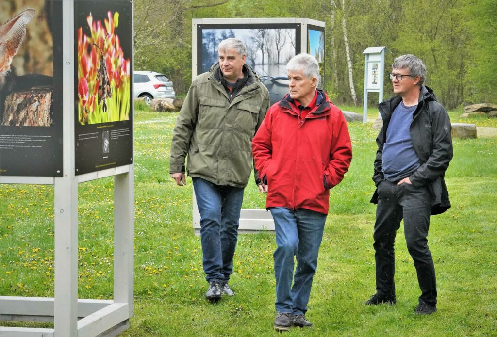 Die scharfen Augen des Uhus ziehen schon von weitem die Aufmerksamkeit auf sich. In so großem Format hat Danilo Böhme seine Fotos noch nie gesehen. Deshalb kam der Naturfotograf auch eigens aus Gleina auf den Waldspielplatz nach Breitenbach. Auch Martin Schulz ist dabei, der ebenfalls Fotos aus seinem Fundus bereitstellte. Beide sind begeistert von der Präsentation der Fotos inmitten der Natur. Hier auf dem Waldspielplatz hat der Landschaftspflegeverein Mittleres Elstertal (LPV) heute (28.04.) die Ausstellung „Faszination Natur – Bilder aus Mitteldeutschland“ eröffnet. 20 großformatige Naturfotos von 10 Fotografen zeigt die Schau, die der LPV aus Anlass seines 25-jährigen Bestehens aufgebaut hat.