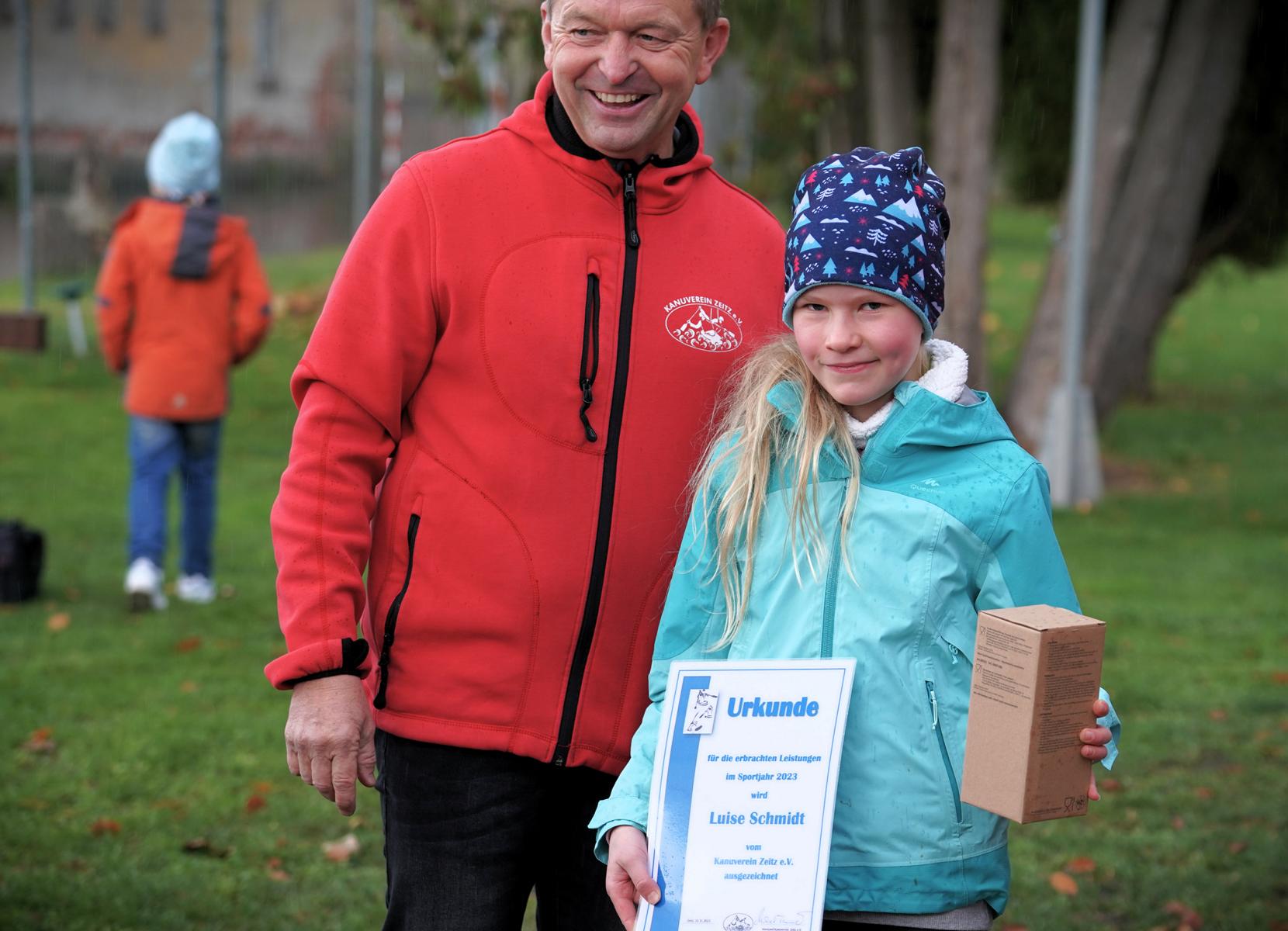 Luise schaut noch etwas schüchtern ins Publikum und zum Vereinschef. Sie ist eine Jüngsten im Zeitzer Kanuverein. Gerade hat ihr Michael Trummer eine Urkunde und ein kleines Geschenk überreicht. Trotz ihres jungen Alters sitzt sie schon erfolgreich im Boot (Bild rechts).