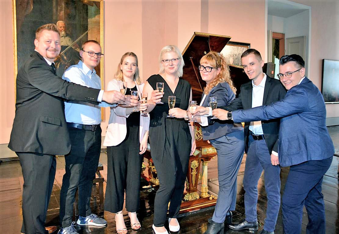 Im Festsaal auf Schloss Moritzburg erhielten heute die 16 frisch gebackenen Fachkräfte ihre Abschlusszeugnisse. Vier von ihnen unterzeichneten ihre Arbeitsverträge mit der Stadt Zeitz (siehe nebenstehendes Foto). Auf dem Bild zu sehen: Ronny Sippel (links), Leiter des Fachbereiches Personal und Organisation, Bürgermeisterin Katrin Weber (rechts) und Aileen Werner (Mitte), die Ausbildungsleiterin der Stadt Zeitz feiern zusammen mit Alexander Tritt, Carolin Reinhäckel, Maria Droth und Niklas Zinke (v.l.n.r).
