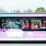 Das Team der Wohnbau Theißen war schon mit einem der Busse zur Übergabe gekommen. Allesamt gut gelaunt, wie zu sehen ist. Schließlich ist es für ihr Unternehmen ein guter Tag. Und ein wichtiger. Denn es kommt nicht alle Tage vor, den hippen Look des neuen Erscheinungsbildes großflächig auf Autobussen präsentiert durch die Stadt fahren zu sehen.