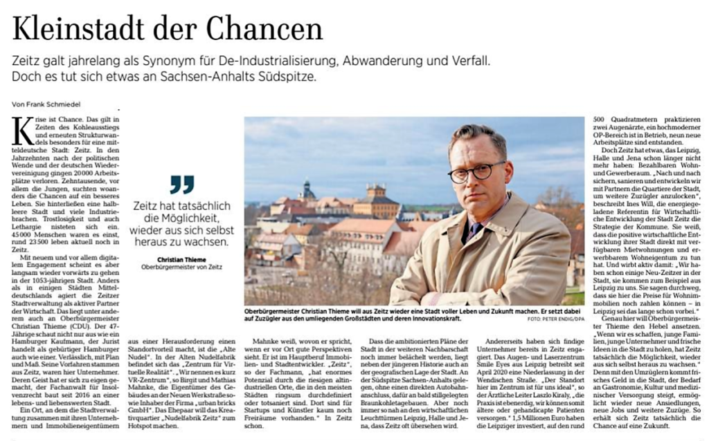 Dass Zeitz eine „Kleinstadt mit Chancen“ sei übertitelt Wirtschaftsredakteur Frank Schmiedel seinen Beitrag in der „Wirtschaftszeitung“ 03/2020, Unternehmerzeitung der LVZ im benachbarten Leipzig.