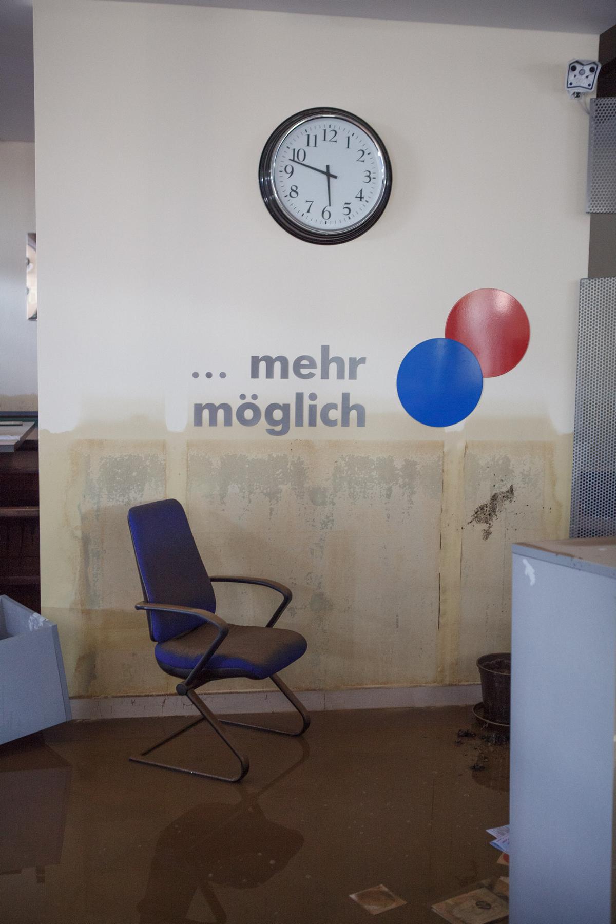 „… mehr möglich“ steht als Leitspruch an der Wand im Büro. Daneben das Firmenlogo, darüber eine Uhr. Direkt unter dem Leitspruch hat die braune Brühe ihre Marke gesetzt. Bis hierher stieg bei der Flut am 1. Juni 2013 das Wasser der Weißen Elster in der Firma EDV Beratung Baumgarten GmbH mit Sitz im Albrechtschen Palais.