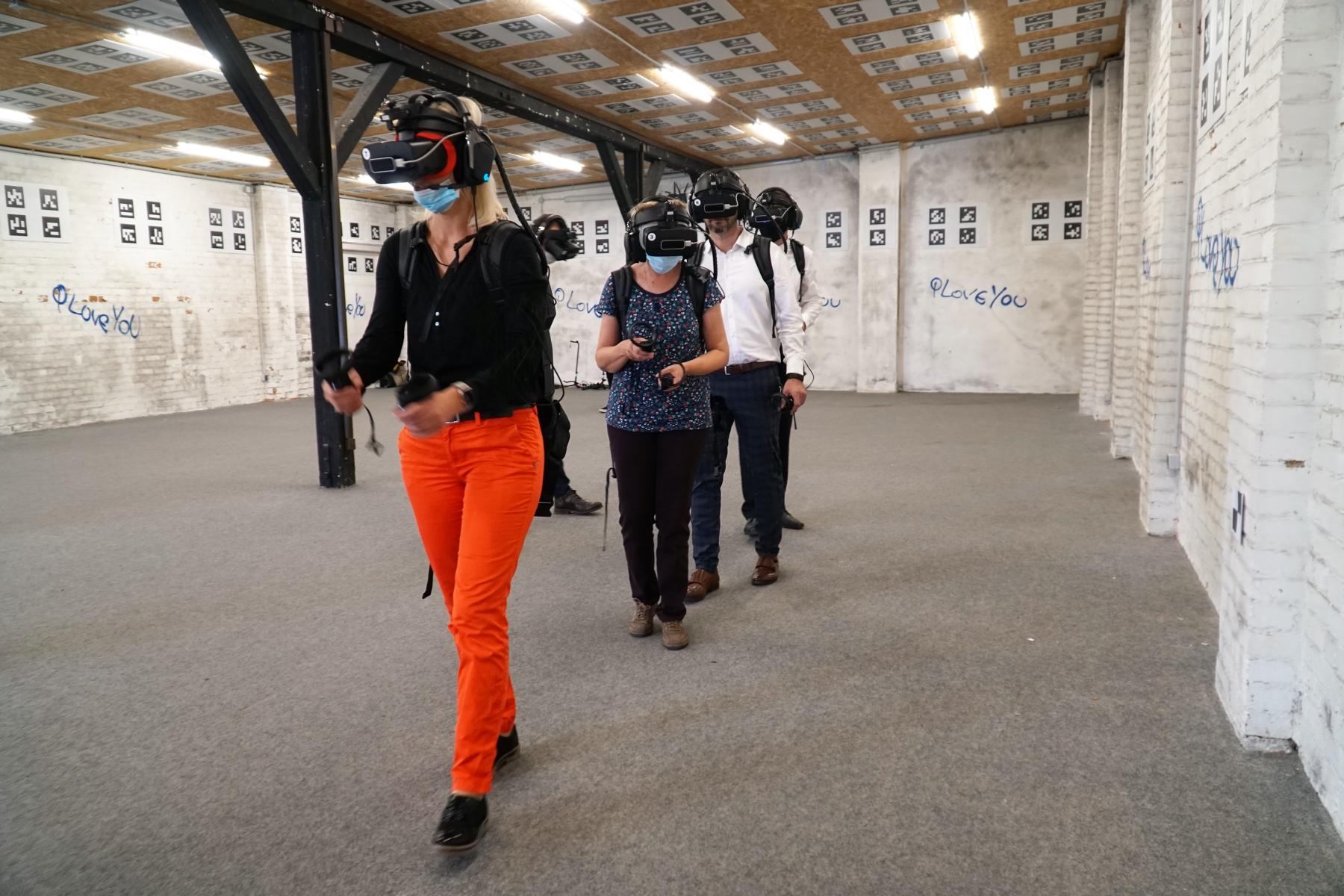 Mit VR-Brillen, Kopfhörern, Kameras und kleinen Rechnern auf dem Rücken können hier Einsätze in Gefahrensituationen trainiert werden. Kameras an den VR-Brillen lesen die Positionen der Probanten an QR-Codes an Decken und Wänden. Nebenan wird anschaulich gemacht, wie diese Simulationen entstehen. Motion Capture heißt das Verfahren, mit dem täuschend echte Situationen simuliert werden. Das Unternehmen Imaging Fire hat sich hier in der Nudel angesiedelt und betreibt das VR- Fortbildungszentrum für Feuerwehr und Rettungskräfte.