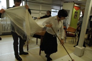 „Ihr müsst euch zu euren Positionen hin spielen.“ Freundlich und bestimmt arbeitet Rotraud Denecke daran, dass auch in Positionswechseln kein unbespielter Raum entsteht. Positionswechsel, kein einfaches Ding für die etwa 30 Laiendarsteller im engen Probenraum. Rundum an den Wänden im Raum Kostüme und allerlei improvisierte Ausstattung. Unter einem Stuhl liegt geduldig Sandy, der Hund, den Annie als treuen Wegbegleiter kennen lernen wird.