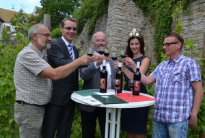 Foto: Zum Wohl auf dem Bürgerweinberg v.l.n.r.: Theo Immisch, Henrik Otto, Dr. Volkmar Kunze, Weinprinzessin Daniela I. und Sebastian Nicolai bei der Verkostung des Jungefernweins „Zeitzer Franziskus“