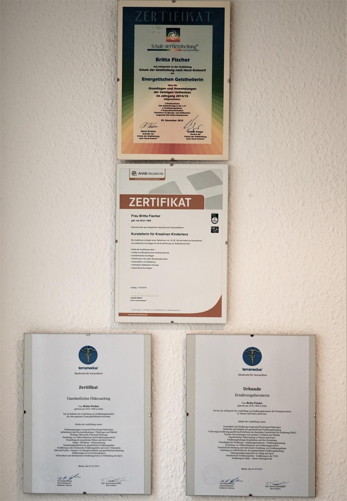 Als ihre Mutter schwer erkrankte spürte sie das Ausgeliefertsein, die Hilflosigkeit. Sie wollte heraus finden, wie man dem begegnen könnte und erkannte – die Psyche ist mindestens so wichtig wie eine gesunde Lebensweise. Körper, Geist und Lebensweise – dieser Dreiklang begann sie mehr und mehr zu interessieren. Inzwischen zeugen in ihrem Studio an den Wänden hängende Zertifikate von dem Fleiß, mit dem sie ihre Ziele verfolgt. Dabei hat Britta Fischer immer ihre Klienten im Blick. Deren Wohlergehen macht sie glücklich.
