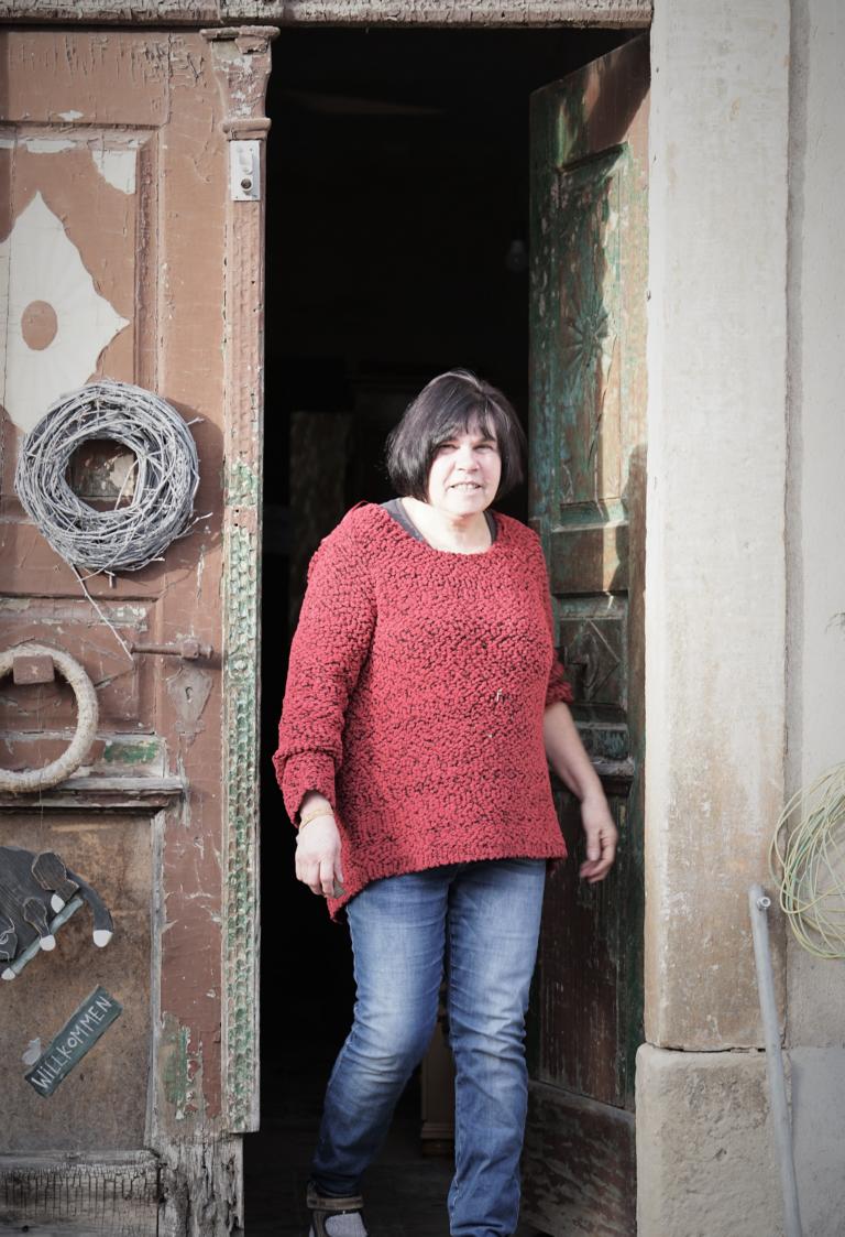 Andrea Hilser hat noch viel vor von hier aus. Zuletzt wurde das Fachwerkhaus aus dem 16. Jahrhundert 1829 umgebaut. Davon zeugen Einträge in den Türbalken des gemütlichen Zimmers, in dem wir sie treffen. 1992 trieb es sie berufsbedingt aus dem Allgäu zunächst nach Groitsch, bis sie 2005 den Hof in Göbitz ersteigerten. Der war früher eine Gaststätte mit Saal und stand seit 1993 leer. Nebenan werkeln Installateure am neuen Bad. Stück für Stück modernisiert Andrea Hilser ihre Bleibe. Das Alte, das Charakteristische möchte sie aber erhalten. Eine Katze macht es sich im Fenster gemütlich und schaut uns von draußen zu.
